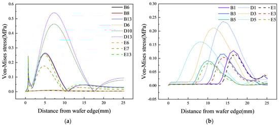 From Figure 12a, it can be observed that when Jut-out ≥ 0 μm, there are two peaks in the von Mises stress curve on the surface of the silicon wafer. The change in pad material does not affect the position of the first peak. Subsequently, a broader and larger stress peak occurs further from the wafer edge. The change in pad material influences both the magnitude and position, and as the Young’s modulus of the pad increases, both the peak value and width decrease. From Figure 12b, it is also evident that when Jut-out < 0 μm, under the same Jut-out conditions, the pad material continues to affect the stress conditions on the surface of the silicon wafer. The lower the Young’s modulus of the pad, the higher and wider the peak.