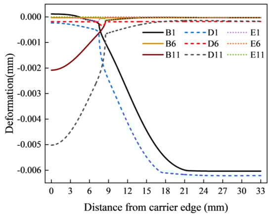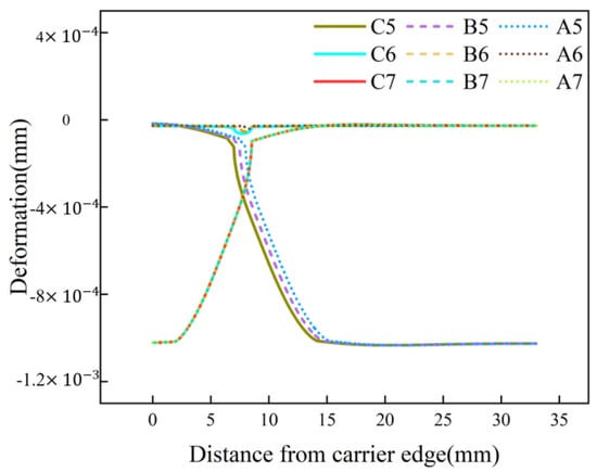 The phenomenon above can be explained by the deformation of the pad depicted in Figure 13. Firstly, when Jut-out > 0 μm, the pad undergoes significant compression. Thus, only a small part of the uniform load transmitted by the pad causes deformation in itself, while a larger portion is transferred to the surface of the silicon wafer. This also exacerbates the degree of pad depression at the wafer edges, where the resultant forces are greater, leading to a greater bending force and a larger peak in equivalent stress on the surface. When Jut-out = 0 μm, the material of the pad does not significantly affect the force on the surface of the silicon wafer. When Jut-out < 0 μm, the lower the Young’s modulus of the pad material, the greater its displacement, resulting in more extensive contact with the silicon wafer surface and, consequently, greater pressure is exerted on the wafer. Therefore, it can be concluded that the lower the Young’s modulus of the pad, the greater the peak.