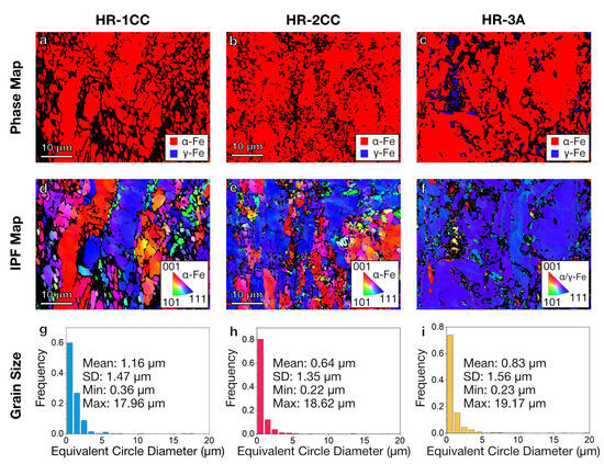 SEM-EBSD phase (a–c) and orientation maps and the grain structure (d–f) of HR-1CC (14YWT powder), HR-2CC (14YWT powder + Fe2O3), and HR-3A (14YWT powder + Y2O3) ODS alloys. (SD: standard deviation). (g–i) grain size distribution and statistics.