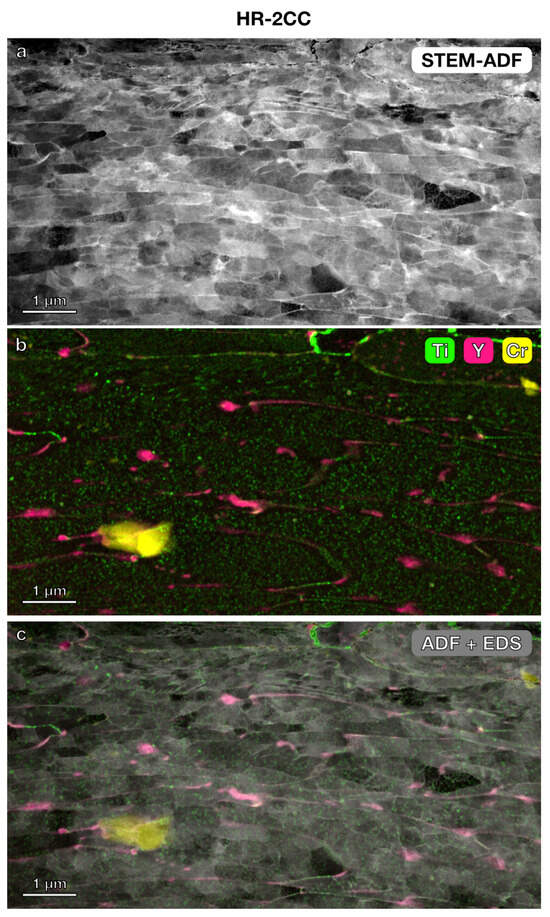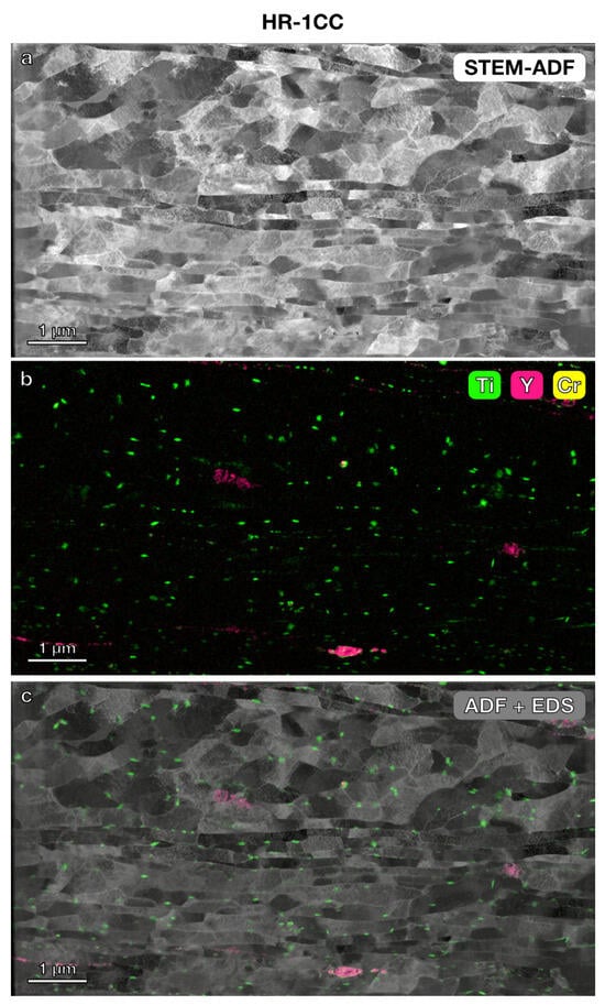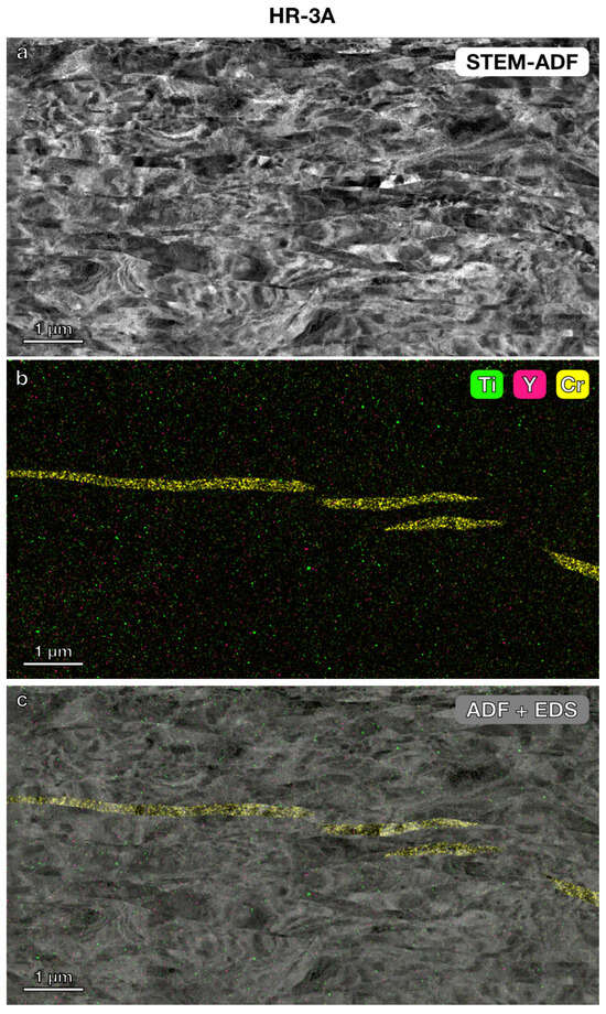 STEM imaging and STEM-EDS elemental mapping were further used to investigate the microstructure and precipitates in the three nanostructured alloys. In the lower magnification STEM annular dark-field (ADF) images (Figure 3, Figure 4 and Figure 5) with a field of view of 6 μm × 4 μm, the grain boundaries were clearly visible. The average grain size measured using the average grain intercept (AGI) method [39] for the three samples ranged from 0.2 to 0.6 μm, which is consistent with the size of the majority of smaller grains (0.2–1 μm) measured by EBSD methods (Figure 2). Note that in this study, we assumed all boundaries were high-angle grain boundaries for ease of quantification. However, SEM-EBSD (Figure 2) and transmission Kikuchi diffraction (TKD) (Figure A1) analysis indicated that many of them are sub-grain boundaries. Ti-enriched clusters (in green) were observed in all three alloys in the EDS maps shown in Figure 3, Figure 4 and Figure 5. Y signals (in pink) were also detected in the EDS maps for these alloys. Larger Y-enriched clusters are clearly visible in HR-1CC (Figure 3) and HR-2CC (Figure 4). However, it’s uncertain whether the fine Y-enriched clusters in the EDS map of HR-3A (Figure 5) represent actual clusters or noise signals, particularly at lower magnifications. Large Cr-enriched clusters (in yellow) were observed in HR-2CC (~1 μm in size) and HR-3A (elongated strips measuring 2–4 μm in length) but were not observed in HR-1CC. The large Cr-enriched clusters in HR-3A may be correlated with the fcc phase observed in Figure 2c by the SEM-EBSD method. Additionally, grain-boundary enrichment of Y and Ti was observed in HR-2CC but not in the other materials (Figure 4). Ti and Y-enriched clusters in HR-2CC were unevenly distributed. Ti-enriched clusters were seen in grains with Y grain-boundary enrichment, while Y-enriched clusters were found in grains with Ti grain-boundary enrichment (Figure 4b).