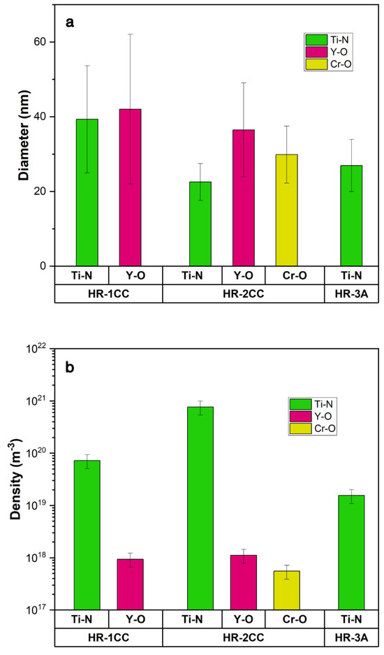 The size and density of the Ti-N, Y-O, and Cr-O clusters were quantified using STEM-EDS maps and are summarized in Figure 8. Overall, Ti-N clusters are the predominant type of cluster in the three alloys. HR-2CC had an order of magnitude higher density of Ti-N clusters (7.6 × 1020 m−3) compared to HR-1CC (7.2 × 1019 m−3) and HR-3A (1.5 × 1019 m−3) (Figure 8b). The average diameters of the Ti-N clusters in HR-1CC, HR-2CC, and HR-3A were 39.3 nm, 22.5 nm, and 26.9 nm, respectively (Figure 8a). The size and density of the Y-O clusters in HR-1CC and HR-2CC were comparable, at approximately 40 nm and 1 × 1018 m−3, respectively. Fine Cr-O clusters were observed exclusively in HR-2CC, with an average diameter of 29.8 nm and a density of 5 × 1017 m−3. In Figure 8a, considering the error in the average diameter, the size differences between the various precipitates may not be significant, generally falling within the range of 20–40 nm.