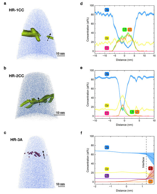 APT (Figure 9) was conducted to quantify the atomic concentration of elements in the nanoparticles and to determine if finer particles (<10 nm) formed in the HR-1CC, HR-2CC, and HR-3A alloys, which may not be detected by STEM-EDS methods (Figure 7). Except for HR-3A, where finer carbon-enriched clusters (likely carbides) with a diameter of ~2 nm were observed, no fine Y-O clusters were detected in the three alloys. No significant Y peaks were observed in the APT datasets of the three alloys (see Figure A2 for the APT mass spectrum). Consistent with the STEM-EDS results (Figure 7), the formation of nitrides in HR-1CC (Figure 9a) and HR-2CC (Figure 9b) was confirmed by the presence of TiN and CrN peaks in the mass spectrum. For the Ti-N particles in HR-1CC, both Ti and N concentrations were 30–40 at%, with no significant change in Cr concentration compared to the matrix (Figure 9d). For the N-enriched particles in HR-2CC, the Ti and N concentrations were 20–25 at%, with a peak Cr concentration of ~45 at% in the particles (Figure 9e). In addition to Fe (~70 at%) and Cr (~20 at%) in HR-1CC (Figure 9f), Ni (7.27 at%), Mn (1.34 at%), and Si (1.06 at%) were also detected, indicating possible impurities in the powder or those introduced during the manufacturing process. The decomposition of peak overlaps is based on natural abundance. Chemical compositions were measured from proximity histograms and 1-D concentration profiles.