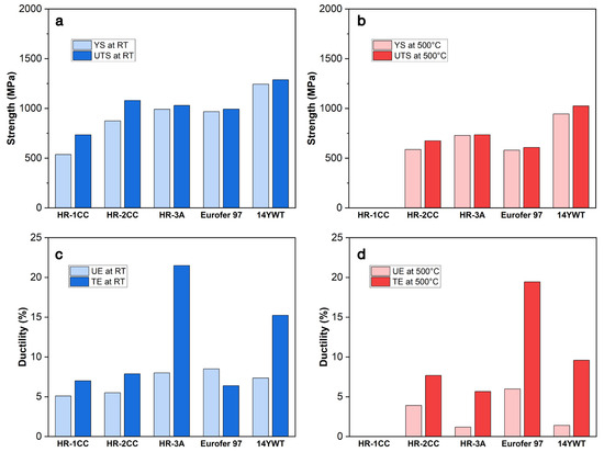 Comparison of yield strength (YS), ultimate tensile strength (UTS), uniform elongation (UE), and total elongation (TE) measured at (a,c) room temperature (RT) and (b,d) 500 °C for ODS-Eurofer 97, 14YWT-SM13 ODS alloys, and ODS alloys produced by the CTMP method (HR-1CC, HR-2CC, and HR-3A). Data from references [31,33,44].