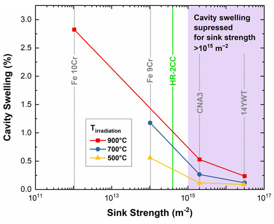Variation of cavity swelling as a function of initial sink strength. (Figure reproduced from [28]). The purple-colored area in the figure represents the estimated sink strength of nanoparticles required to suppress cavity swelling.