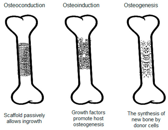 The processes of osteoconduction, osteoinduction, and osteogenesis. Created based on information from [13,14,15].