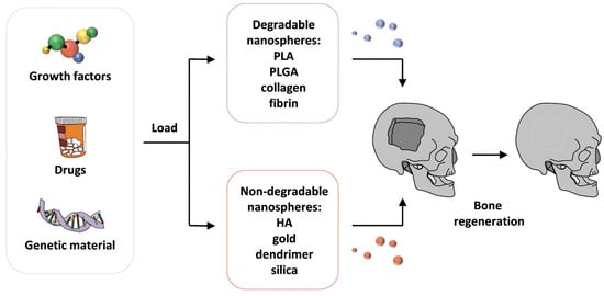 Nanomaterials can be used to incorporate substances, such as growth factors or bioactive molecules, to aid bone regeneration. These molecules can either be incorporated within the nanocarrier or attached to the surface. This allows for a controlled release of the substance directly to the bone defect location, which can improve osteogenesis and the overall effectiveness of the graft [66,94,95]. NPs can be either organic, inorganic, or carbon-based. At the same time, some of them are biodegradable, such as polymers (poly(l-lactide) (PLA), poly(l-lactide-co-glycolic) (PLGA), collagen, fibrin), while others are non-biodegradable (metal NPs, HA, silica) [66,92,96,97]. However, they can all be used in bone grafts for bone regeneration. This process is illustrated in Figure 3.