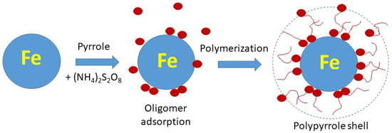 Carbonyl iron, a highly pure iron, is industrially produced by the thermal decomposition of liquid iron pentacarbonyl, Fe(CO5). It is typically obtained and distributed as a powder composed of spherical microparticles. Most authors felt the need to protect iron surfaces from corrosion before the deposition of polypyrrole. The iron surface was coated with an overlayer to protect the metal from corrosion, e.g., by silanization [1,2]. Alternatively, carbonyl iron was treated with hydrochloric acid to introduce hydroxyl groups onto the surface [3,4] that act as potential grafting sites for polypyrrole, or the iron surface was etched with dilute nitric acid [5]. The grafting of carbonyl iron with poly(pyrrole-functionalized ethyl methacrylate) also falls into this category [6]. The surface of iron microparticles was coated with carbon nanotubes using polypyrrole as a binder [7]. Carbonyl iron was also modified with a protective layer of polydopamine [8] or silica [2,9] before polypyrrole deposition.