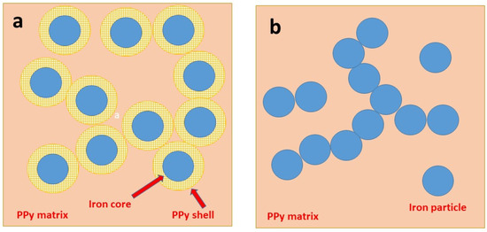 A comment is relevant: in addition to the coating of iron microparticles with polypyrrole, free polypyrrole generated outside them will be a part of the resulting composite powder (Figure 4a). Macroscopically, however, the composite behaves as homogeneous, i.e., it is attracted to the permanent magnet as a whole and it does not seem to contain any separate free non-magnetic polypyrrole part. We speculate that the polypyrrole chains produced outside iron particles are intertwined with those constituting the coating.