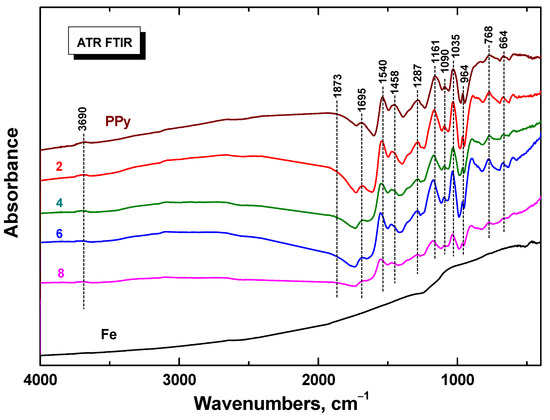 Infrared spectra of composites in dependence on iron content obtained in ATR reflection mode (Figure 5) corresponded to the spectrum of the initial polypyrrole powder (spectrum PPy). The maxima of the main bands were well detected at 1695, 1540, 1458, 1287, 1161, 1090, 1035, 964, 768, and 664 cm−1 [44]. The spectrum of iron is featureless and does not exhibit an absorption peak. The shape of spectra slightly change with an increasing amount of iron in the reaction mixture. The intensity of the broad absorption band at wavenumbers above 2000 cm−1 (polaron band) decreased in correlation with the decreasing conductivity of the composites. This is also supported by a slight shift of the bands at 1540, 1458, and 1161 cm−1 to the higher wavenumbers, which is characteristic for the deprotonation of polypyrrole [47].