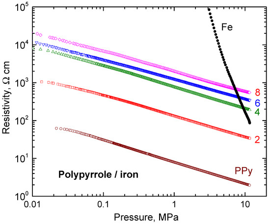 A similar trend is observed for all composites (Figure 7). The pressure dependences, p, of resistivity, ρ, are close to linear in double-logarithmic presentation, log ρ = A + B log p, A and B being parameters. They are less steep compared to iron (Table 2), and electrical properties are clearly controlled by the polypyrrole matrix (Figure 4). The parameter B provides the information about how fast the powders decrease their resistivity during compression and can be regarded as a measure of composite fluffiness.