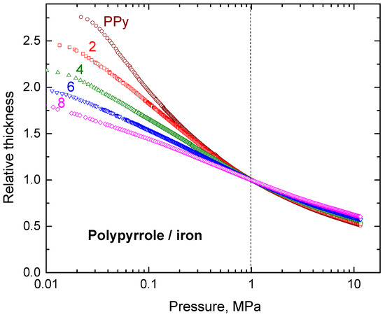 The present experimental determination of resistivity also allows for the assessment of the mechanical properties of composite powders (Figure 8). Polypyrrole alone has a fluffy consistency. It is easily compressed, and the sample thickness is readily reduced at low pressures. With the increasing content of iron, the composites become stiffer, and the change of the thickness at increasing pressure is less pronounced. The behaviour of all samples is similar at pressures above 1 MPa.