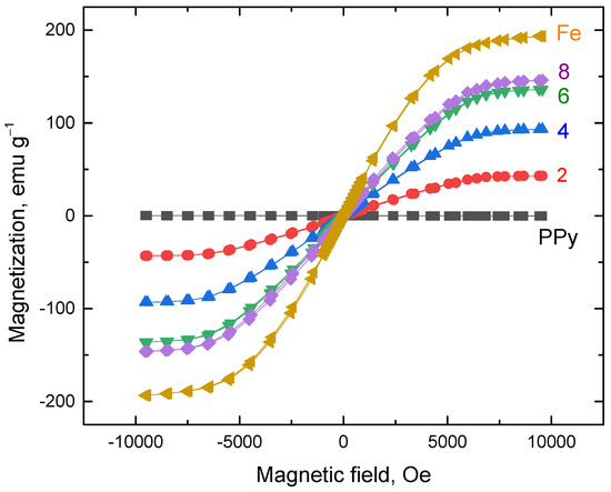 As anticipated, the highest magnetization value of 193 emu g−1 (Table 2, Figure 9) was observed in the neat carbonyl iron. Given that polypyrrole does not exhibit intrinsic magnetic properties, the saturation and remanence magnetization of the composite materials are primarily determined by the iron content, in accordance with the hysteresis curves. For example, the composite prepared with 4 g of iron contains about ≈60 wt% of this metal (Table 1) and achieves about half the remanence and magnetic saturation compared to the carbonyl iron powder. The coercivity and remanence values (Table 2), along with the shape of the magnetization curve, indicate that the composites behave as magnetically soft materials, like the carbonyl iron itself. No significant differences in coercivity have been detected.