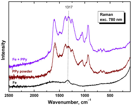 Raman spectra of PPy/Fe composites in dependence on iron mass entering the preparation (Figure 6) exhibited only the main bands of neat PPy (spectrum PPy) situated at 1586, 1492, 1380, 1324, 1250, 1086, 1054, 978, 936, 683, and 611 cm−1 [47]. The laser excitation wavelength 780 nm was in resonance with the energy of delocalized polarons and bipolarons of polypyrrole [47]. The penetration depth was reduced to a few tens of nanometers and the Raman scattering occurred only at the surface of the polymer. The spectra are relatively noisy due to the low laser power used not to burn the thin films deposited on iron microparticles. No relatively sharp Raman peaks of iron (spectrum Fe) were detected in the spectra of composites, and this supports the concept of the completeness of polypyrrole coating (Figure 1).