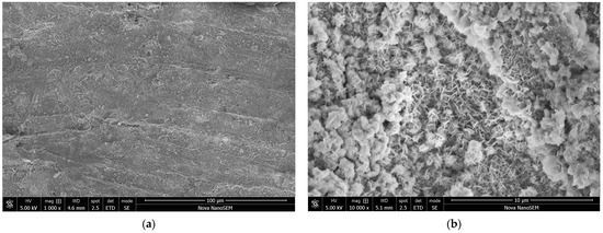 The surface morphology of the iron nail at two magnifications. Scale bars 100 μm (a) and 10 μm (b).
