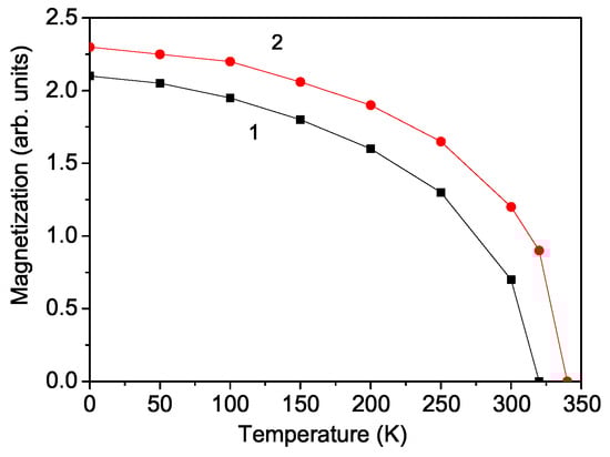 Figure 1 presents . It is evident that PFAO demonstrates the ferromagnetic behavior, with M decreasing as the temperature rises and reaching zero at = 320 K. It is the transition temperature from the ferromagnetic to paramagnetic phases, as reported by Liu et al. [2]. This ferromagnetic behavior is primarily attributed to the super-exchange interaction between the Fe and Pr ions (Fe3+-O-Pr3+). Moreover, magnetization increases with a higher magnetoelectric coupling constant g (see Figure 1, curve 2).