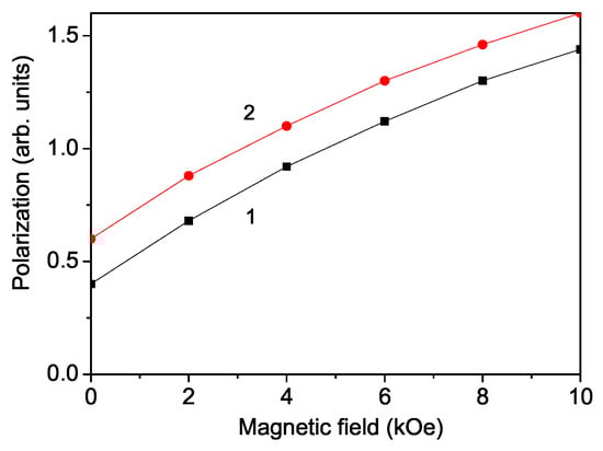 The polarization is analyzed using Equation (14). A key characteristic of multiferroic materials is the impact of an external magnetic field on their electric properties (and similarly, the influence of an external electric field on their magnetic properties). To explore the multiferroic nature of PFAO, we calculated the magnetic field dependence of the polarization P. This behavior arises from the magnetoelectric coupling g, which renormalizes the pseudo-spin exchange interaction constant to :