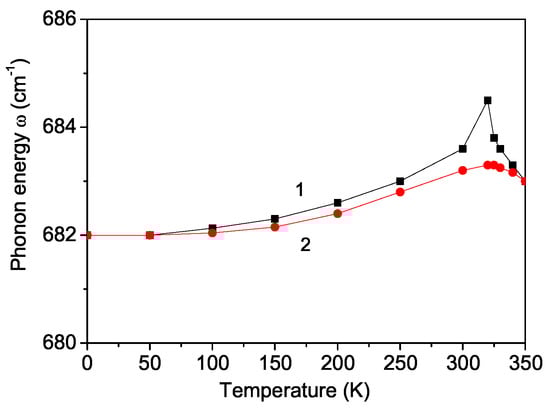Now, we will investigate the temperature dependence of the A1g phonon mode with a frequency of = 682 cm−1. Reference [22] calculated the temperature behavior of the phonon energy in hexagonal bulk multiferroics for different R, which can be either positive () or negative (). It was found that for , the phonon energy increased with temperature below , whereas for , it decreased with the rising temperature. For PFAO, we assumed a positive anharmonic spin–phonon constant (). The result is depicted in Figure 3, curve 1. It shows a softening below . It is noteworthy that Filho et al. [12] reported a similar decrease in temperature dependence of the phonon mode = 652 cm−1 below the ferromagnetic phase transition temperature = 100 K in the double perovskite Y2NiMnO6. A similar behavior was noted in several double perovskites (La2NiMnO6, A2CoMnO6, where A = La, Pr, Nd) [23,24], respectively, confirming the presence of spin–phonon coupling in these materials. Additionally, a distinct kink in the curve at = 320 K was observed (see Figure 3, curve 1), which indicates a strong spin–phonon interaction R. This finding suggests that the stretching vibrational mode of the oxygen octahedra plays a role in stabilizing the magnetic interaction. The combination of ferromagnetic ordering and spin–phonon coupling below leads to a decrease in the phonon mode with decreasing temperature T. Bhatti et al. [25] reported a similar kink at = 172 K in the temperature dependence of both phonon energy and damping in the double perovskite manganite Pr2CoMnO6.