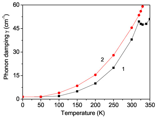 The phonon damping , represented by the full width at the half maximum (FWHM) of the Raman peaks, enhances with an increase in temperature. It is important to note that rises with T for both and , as it is proportional to . Figure 4, curve 1, illustrates the temperature dependence of phonon damping without the magnetic field, h = 0. increases with an increase in temperature T and also shows a kink at , although this kink is smaller than that observed in the phonon energy . The phonon damping increases, i.e., the width of the Raman line becomes larger, and the kink disappears with the application of a magnetic field h (see Figure 4, curve 2).