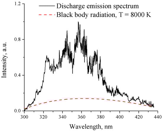 To estimate the temperature of the discharge, we considered the shape of the emission spectrum as black body radiation. Fitting the spark discharge emission spectrum to that of black body radiation, as shown in Figure 3, yielded an estimated temperature of approximately 8000 K, which aligns with previous works [22] on nanosecond-pulsed spark discharge in liquid nitrogen. The shadow imaging and optical emission spectroscopy of the nanosecond-pulsed discharge in liquid nitrogen indicate that the discharge region produces both high pressures and temperatures, which will be discussed further in the following sections.
