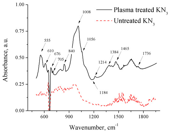 FTIR spectra of potassium azide before and after plasma treatment (spectra shifted vertically for clarity).