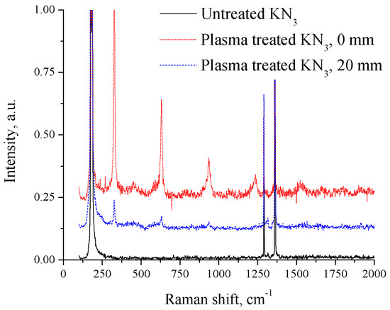 The Raman spectra of both untreated and plasma-treated potassium azide are shown in Figure 5. In the 20 mm distance setup, several new peaks formed after 30 min of treatment under liquid nitrogen, at 326 cm−1, 630 cm−1, and 937 cm−1. For a shorter-distance setup, two additional peaks located at 1235 cm−1 and 1523 cm−1 appeared.