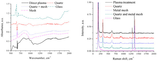 FTIR (left) and Raman (right) spectra of potassium azide treated by plasma in various setups as described in Table 2 (spectra shifted vertically for clarity).
