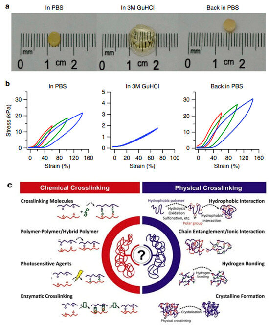 (a,b) Overview of the physical and mechanical characteristics of (FL) hydrogels. Reprinted with permission from [35]. https://doi.org/10.1038/ncomms3974. (c) Diagram illustrating the different types of physical and chemical cross-linking methods used in hydrogels (adapted from [36], CC-BY license) https://doi.org/10.3390/gels7040255.
