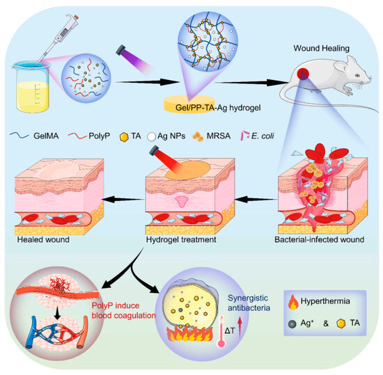 The fabrication process of Gel/PP-TA-Ag hydrogel, designed for wound healing with hemostatic and antibacterial properties. Reprinted with permission from [44]. https://doi.org/10.1016/j.nantod.2021.101165.