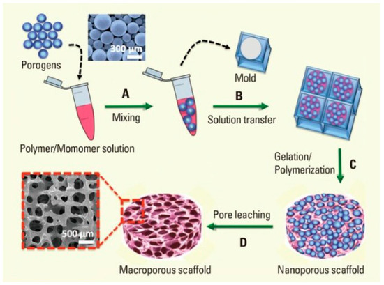 Diagram showing the steps involved in creating macroporous hydrogel scaffolds using sacrificial porogens. (A) Degradable particles are gathered and dispersed in a cross-linkable prepolymer solution. (B) The mixture, containing the porogens (in this case, microspheres), is poured into a mold before solidification. (C) Gelation occurs as the polymerization process encapsulates the leachable porogens. (D) Controlled degradation of the porogens results in the formation of a three-dimensional porous network with interconnected macropores and channels. Reprinted with permission from [47]. https://doi.org/10.5051/jpis.2013.43.6.251.