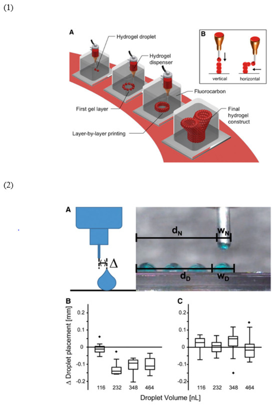 (1) Overview of the submerged bioprinting technique. (A) Cell-laden hydrogel droplets are sequentially deposited layer by layer following a predefined model to create a three-dimensional tissue structure. This process takes place within a high-density fluorocarbon liquid that provides buoyant support. (B) Hydrogel droplets can be added either vertically or horizontally to an existing structure. The fluorocarbon support allows for the creation of branching hydrogel structures or cantilever-like formations without needing a solid foundation. (2) Dispensing accuracy. (A) To evaluate the precision of the dispensing process, the offset distance (Δ) from the needle’s center to the printed drop was measured, along with the drop diameter. The dispensing deviation was calculated using Equation (1). Printing accuracy was compared between printing in air (B) and printing in FC-43 (C), with submerged printing showing improved accuracy. The findings are displayed in boxplot diagrams, n = 20. Reprinted with permission from [57]. https://doi.org/10.1089/biores.2013.0031.