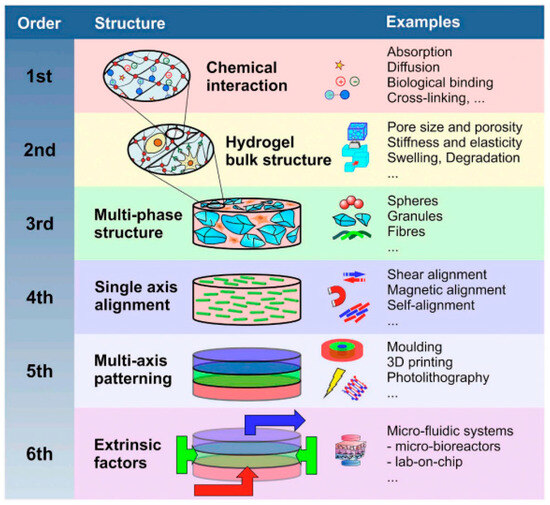 Tissue engineering aims to develop functional constructs that restore, maintain, or improve damaged tissues or organs. Hydrogels play a pivotal role in this field due to their high water content, biocompatibility, and tunable mechanical properties that can mimic the extracellular matrix (ECM) of natural tissues [5]. These properties enable hydrogels to provide a supportive environment for cell proliferation and differentiation, which is essential for tissue regeneration.