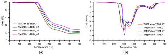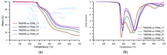 Also, thermal degradation was strongly dependent on the copolymer composition. Namely, the higher the content of TMSPM, the higher the thermal stability in both inert and oxidative atmospheres. In helium, the thermal stability increased from 269 °C to 283 °C, while in synthetic air it increased from 266 °C to 298 °C, considering a 5% mass loss temperature. It is worth mentioning that TMSPM-co-TRIM_3 and TMSPM-co-TRIM_4 copolymers were more stable than pure poly(TRIM). The conducted investigation also showed that the thermal degradation process occurred through three stages and that the copolymers did not degrade completely. The final residues at 700 °C were in the range of 12–31% (in helium) and 17–26% (in synthetic air) of the starting masses. Analogously, like in the case of a porous structure, increasing the amount of the methoxysilane monomer contributed to an improvement of the multifunctional properties of the final copolymers.