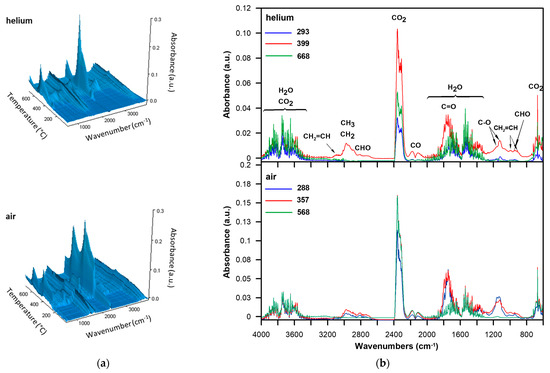 FTIR spectra of volatile products evolving during the thermal degradation of TMSPM-co-TRIM_2T: (a) in the whole temperature range of the measurement and (b) extracted at the maxima of degradation.