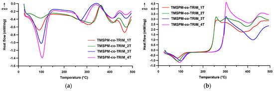 With the increase in the quantity of functional monomer (TMSPM) in the copolymer, the volume of adsorbed water considerably increases. There is only one exception to this rule: the observed effect for TMSPM-co-TRIM_1T is bigger compared with the one for TMSPM-co-TRIM_2T. This phenomenon can be explained by the more developed internal structure of TMSPM-co-TRIM_1T (especially in terms of pore volume) and its consequent higher adsorption capacity. The enthalpy of the evaporation process increased from 33 J/g for TMSPM-co-TRIM_2T to 299 J/g for the TMSPM-co-TRIM_4T copolymer. The second endothermic peak, whose maximum increased with the degree of crosslinking (from 271 to 316 °C), can be referred to as the degradation reactions of the ester groups. Its enthalpy is in the range 66–85 J/g depending on the monomer composition. The exothermic peak following the first step of endothermic decomposition can be attributed to a thermal crosslinking reaction of double bounds. They were formed in the first step of the thermal degradation by the β-bond scission reactions. The last endothermic peak is connected to the thermal degradation of the rigidly crosslinked part of the copolymers. The enthalpy of this process increases along with the increment of crosslinking degree from 18 J/g for TMSPM-co-TRIM_4T to 70 J/g for TMSPM-co-TRIM_1T. As regards the experiments conducted in air, mainly the exothermic peaks are visible on the DSC curves (Figure 9b). They considerably prevail over the minute endothermic peak at about 100 °C. An analogous one was also observed in the helium atmosphere. The exothermic peaks are connected to the degradation of the investigated polymers that occur via oxidation processes.