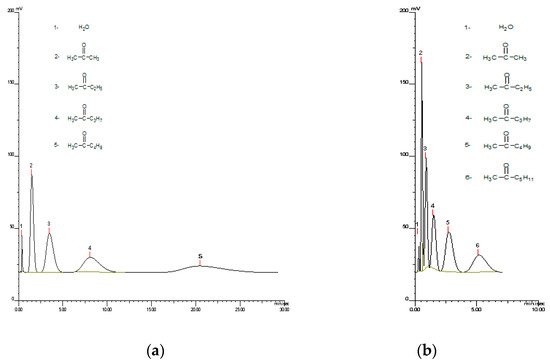 The high thermal stability of the obtained copolymers opened the possibility of their application as stationary phases in gas chromatography. Additionally, the presence of polar units offers hydrophilic properties. It permits the interaction of the poly(TMSPM-co-TRIM) copolymer with polar compounds. Figure 10 displays a chromatograph of a mixture of aliphatic ketones. The measurements were conducted at 140 °C and 200 °C. The time required for ketones separation was shorter at a higher temperature. What is more, at 200 °C, the peaks were not diffused. Thus, it can be assumed that copolymers with greater thermal stability are more useful for GC applications.