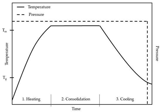 The thermal process, consisting of these three stages, is schematically represented in the Figure below (Figure 2). The diagram illustrates a process where constant pressure is applied throughout each stage. However, an alternative approach involves applying lower pressure during the initial stages (heating and early consolidation) and increasing it during the later stages of consolidation and cooling [63].