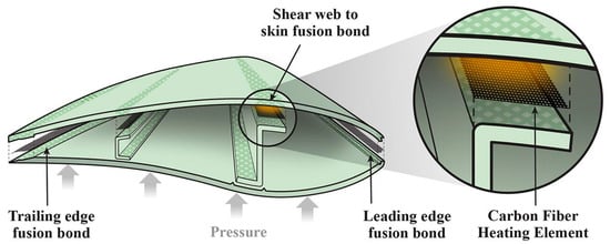 Beyond the aerospace industry, which has shown a keen interest in fusion bonding of thermoplastic composites using resistance welding, the wind energy and automotive sectors are also exploring this technology [110]. As shown in Figure 3, panels of 1 m2 and a 5-meter-long blade tip were manufactured using the thermoplastic resin Elium® (Arkema, France), featuring fusion-welded joints and lightening protection system [111].