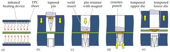 Schematic illustration of process-integrated embedding of weld inserts in thermoplastic composites: (a) warming up the TPC sheet (red arrows indicate heat flow), (b) closing the compression mould (yellow arrows indicate the direction of mechanical forces), (c) shifting forward the pin tool, (d) recompressing the squeezed-out material by the counterpunch, (e) demoulding of the TPC specimen [129].