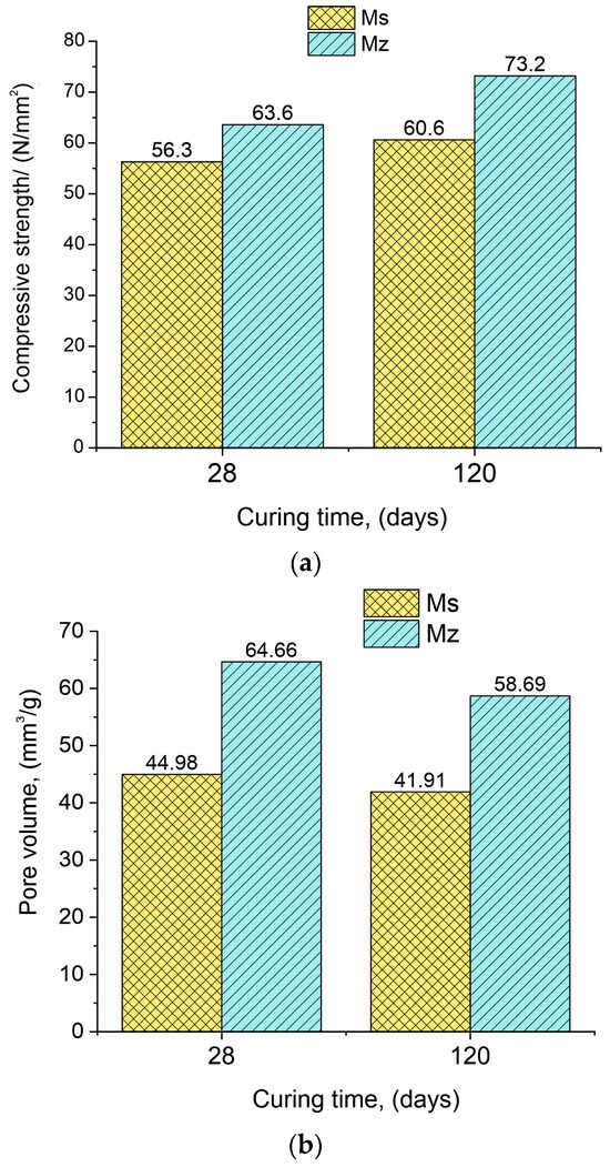 The compressive strength of both samples Ms28 and Mz28 is very high and continues to grow over time. The use of zeolite as a partial binder substitute increases the 28-day (Mz28) compressive strength in comparison with the same parameter for the Ms28 sample, with approximately 13.0% (Figure 1a). At 120 days of curing (samples Ms120 and Mz120), the difference between the compressive strengths is increased by 20.8%.