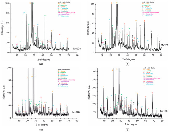 The PXRD analysis (Table 5 and Figure 6a–d) shows the presence of two groups of minerals in the studied samples: (i) relict minerals from the initial composition: belite, albite, anorthite, Mg-rich calcite, quartz, and dolomite; and (ii) newly formed minerals: portlandite, yugawaralite, scolecite, ettringite, tobermorite 11A, and hibschite. The results of the complete analysis of the phase composition of the samples are presented in Table 4 and Figure 6a–d. The new phases are from CSH and CSAH gels. The formation of the CSAH phases is possible because of the presence of the cementitious minerals from the starting raw materials and the use of quartz sand as a filler, in the composition of which SiO2 and Al2O3 are present (Table 2). Furthermore, its porous structure creates a basic framework that facilitates the formation of crystal hydrate phases (ettringite, tobermorite 11A, and scolecite) in the cavities and interlayer spaces into which water molecules can be inserted. Subsequently, they are used to carry out secondary hydration processes and grow new crystal hydrates. Two of the phases, yugawaralite and hibschite, are identified only in the Mz series samples. Most CSH are formed in both series because they contain quartz and aluminates imported from cement minerals and river sand.