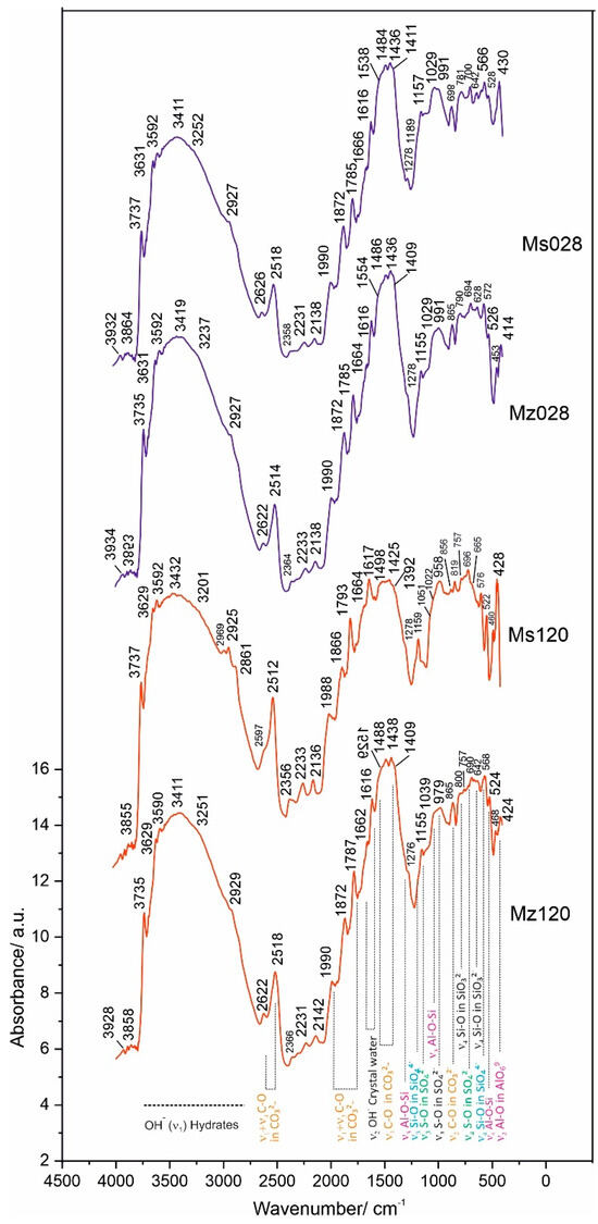 Using the DRIFTS method, the vibrational fluctuations of the Me-OH bonds are better expressed in the spectra. This is evidenced by the well-formed bands in the ν3 region 3600–3750 cm−1. In this particular system, this bond is realized both between Ca-OH at ν3 3629–3631 cm−1 and between Al/Si-OH in the crystal hydrates of CSH and CSAH phases at ν3 3737 cm−1.