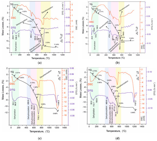 Thermogravimetric analysis, combined with derivative thermogravimetry and differential scanning calorimetry, is a powerful tool to complement the results of the analytical methods used. Highly sensitive modern instrumentation allows precise measurements of mass loss, heat effects, phase transitions, solid-phase synthesis, and other important characteristics of the samples, which reveal new data and provide new evidence for both the structure of the samples and their thermal behavior in the programmed heating regime. This also defines thermal analysis methods as very suitable both for the identification of structure-phase transformations and as an acid-free method for solid-phase synthesis [51,52]. In the present work, the simultaneous TG/DTG-DSC measurements were performed in an air-gas environment up to 1300 °C and using dynamic heating mode. Cement mortars are systems of inorganic composites mainly based on the oxides of calcium, silica, and aluminum. In these solutions, the chemical elements involved are usually in their higher oxidation state and are therefore not sensitive to oxygen from the air. This allows the experiments to be carried out at high temperatures up to 1200–1300 °C in a static air environment without the risk of additional oxidation reactions or syntheses between the main oxides as the results obtained are in response to the thermal decomposition of the constituent phases. This provides a rationale for using the complex of thermal methodologies to identify and, in this case, to complement the results of the other analytical methods and especially to characterize the process and products of hydration of the studied white cement solutions.