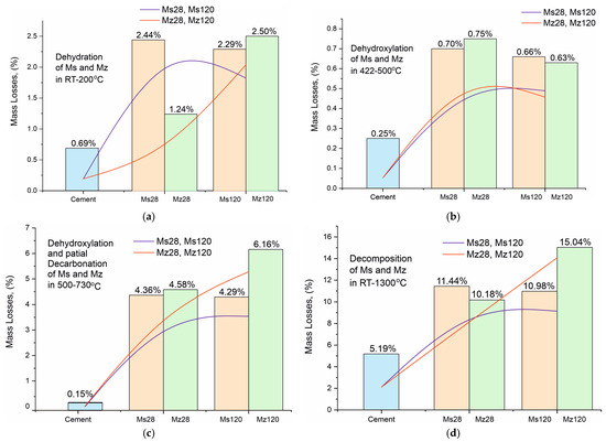 For a clearer illustration of the effect of using thermally activated zeolite in building mortars, the results from the thermal studies are presented in the form of trend plots for the mass losses of the individual processes of dehydration of crystallization water (Figure 9a), dehydroxylation of structurally bound water by Ca(OH)2 (Figure 9b), dehydroxylation and partial decarbonation of CSH/CSAH (Figure 9c), and total mass losses (Figure 9d). The data for the Ms series are in orange, for the Mz series in green, and for the white cement used for comparison in blue. The red and blue lines represent the increasing and decreasing trend of ML, respectively, for a given process. The mass loss data dynamics from crystallization water dehydration (Figure 9a) present a decreasing trend for the Ms series and an increasing trend for Mz, particularly well pronounced when comparing the ML data between Mz28—1.24% and Mz120—2.50%, which is the highest value. This means that water is retained when the thermally activated zeolite is used, and it is distributed as crystallization and structurally bound. The ML trends of the structurally bound water (Figure 9c) best illustrate the impact of using zeolite. Both series recorded relatively high MLs between 4.29% to 6.16%. The distinctly higher values are for the Mz series. This is the clearest evidence for the role of zeolite as a natural pozzolan and the possibilities for a secondary continuous hydration. Accordingly, this trend also applies to the total mass losses (Figure 9d), which increase by approximately 5% in the Mz series due to the increase in ML in the third stage, while they remain approximately the same 10–11% for the Ms series. The ML change trend from dehydroxylation of structurally bound water to Ca(OH)2 is the least pronounced, but nevertheless, a decreasing tendency can be noted in the Mz series.