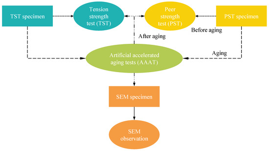 In this study, a series of laboratory tests were designed to investigate the physical properties of geonet materials during the aging process and to further establish a service life prediction method used for slope protection design. The testing procedure is depicted in Figure 2. After specimen preparation, most specimens were placed in accelerated test devices for aging; the rest of the specimens were used for the tension strength and peer strength tests before aging to obtain their initial strengths. Subsequently, the specimen underwent different aging-elapsed times and was taken out of the aging device for further strength test and SEM observation. More information will be provided in the following sections.