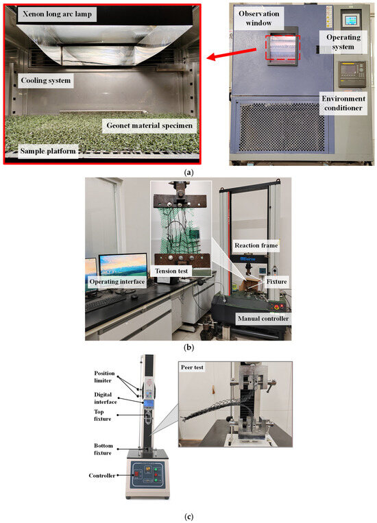 The laboratory artificial accelerated aging test (AAAT) is designed to investigate 3D geonets’ aging behavior in a short period of time, which artificially enhances or simulates the actual working conditions of the climatic environment. To effectively simulate the effects of various factors, such as light, high temperature, rain, humidity, and condensation under natural conditions, the SX432S Xenon Lamp Weather Resistant Aging Tester (Figure 3a) manufactured by SPECTRO Environmental Instruments Co., Ltd. (Guangzhou, China) was selected and used in this study, which can meet the requirement of Standard Practice for Exposing Nonmetallic Materials in Accelerated Test Devices that Use Laboratory Light Sources (ASTM G151-10) [28]. The spectral range of this device varies from 290 nm to 800 nm, and the irradiation intensity can be controlled and continuously adjusted from 20 W/m2 to 1200 W/m2. The temperature and the humidity can be performed from −40 °C to 150 °C and 20% to 98%, respectively.
