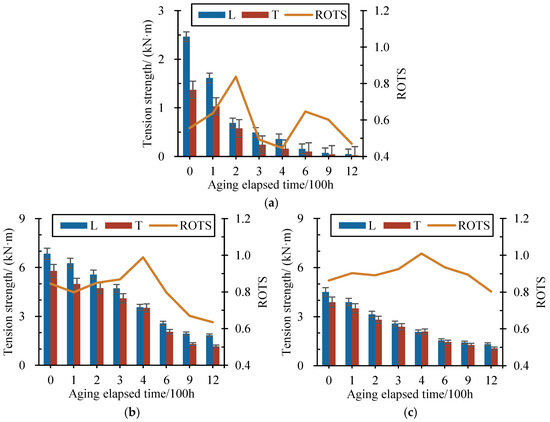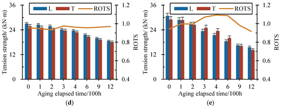 After tension strength tests and artificial accelerated aging tests, the tension strengths of each type of geonet after different aging-elapsed times were obtained. Figure 4 depicts the variation in longitudinal (L) and transverse (T) tension strength of each type of the 3D geonet with aging-elapsed time, where the ratios of orthogonal tension strength (ROTS) are also demonstrated, calculated by dividing the transverse tension strengths by longitudinal ones.