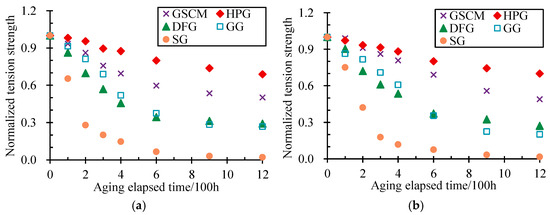 As shown in Figure 4, the tension strength among different geonet materials and directions all showed a descending trend with aging-elapsed time, where the magnitude of the strength reduction was diverse. The SG had the smallest initial tension strength and almost lost its strength after 900 h of aging, followed up by the GG and the DFG, which had 2–3 times higher initial tensile strength than that of SG, while it also fell into the range of 1–2 kN/m of the residual strength after 1200 h of aging. The initial tensile strength of the HPG and the GSCM was one order of magnitude higher than that of other types of geonet materials. Comparing Figure 4d with Figure 4e, it can be observed that the decrease in the tension strength of the GSCM during the aging process was faster than that of the HPG, and the residual strength of the GSCM was lower despite the higher initial tensile strength. In addition, except for the strengths of GSCM during 300–600 h of aging, the transverse tension strengths of the rest of the materials were less than the longitudinal ones.