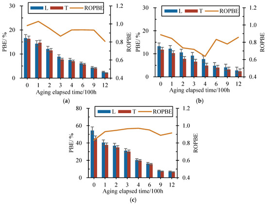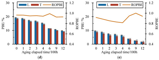Variation in longitudinal (L) and transverse (T) PBE and ratio of orthogonal PBE (ROPBE) with aging-elapsed time. (a) SG. (b) GG. (c) DFG. (d) HPG. (e) GSCM.