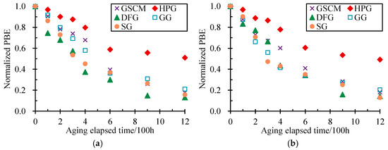 - The percentage of breaking elongation (PBE) showed a continuous decline in trend with the increase in aging-elapsed time. Compared to the initial PBE before aging, the PBE of the HPG decreased by approximately 50% after 1200 h of aging, while the rest of the materials decreased their PBE by 79–87%.