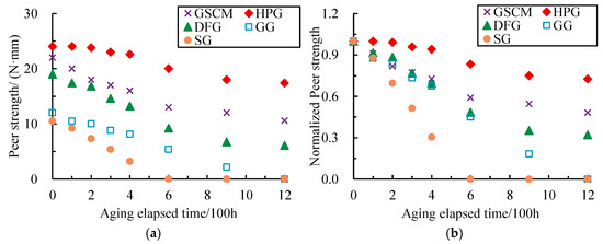 As shown in Figure 10, the peer strength linearly decreased with the aging-elapsed time before 600 h of aging; then, its decreased tendency slowed down and gradually reached a stable stage at up to 1200 h of aging. The SG totally lost its peer strength after 600 h of aging, and the GG completely lost this property after 1200 h of aging. The rest of the materials retained some peer strength, with the DFG at 0.32 times of initial peer strength, the HPG at 0.73, and the GSCM at 0.48.